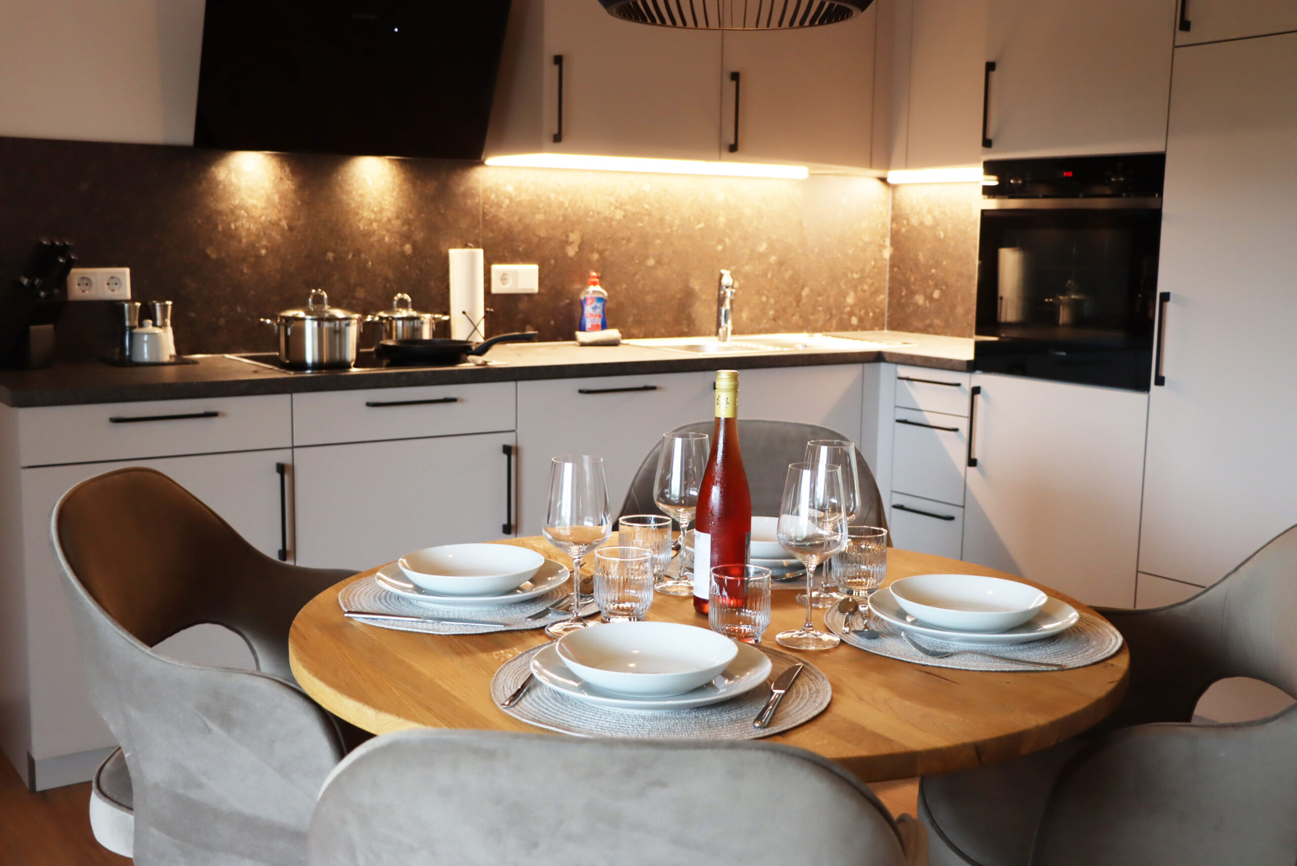 ✔ Voll ausgestattete Küche + großer Esstisch mit Polsterstühlen