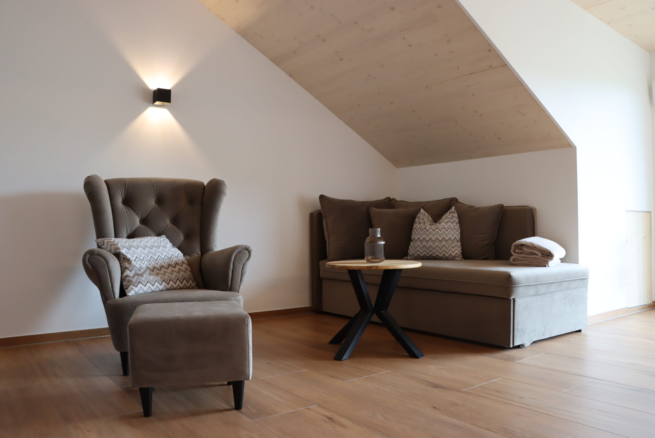 ✔ Gemütliche Wohnlounge mit Ausziehcouch, Ohrensessel & Beistelltisch