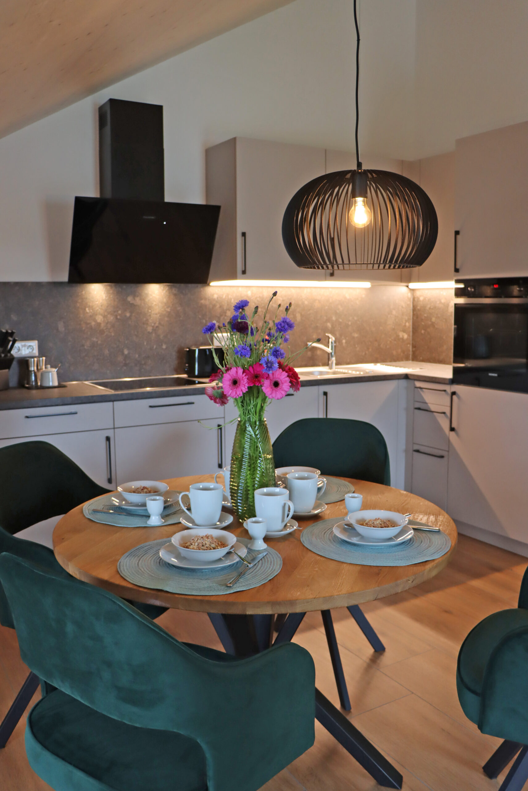✔ Voll ausgestattete Küche + großer Esstisch mit Polsterstühlen